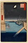 ![]() | 4. Tsukudajima y el puente Eitaibashi (永代橋佃しま Eitaibashi Tsukudajima?) (2-1857) | Aquí se introduce una visión nocturna, donde se percibe un muelle de la pequeña isla de Tsukuda, en la bahía de Edo, vista desde el puente Eitaibashi («Puente de la Eternidad»), perceptible en un amplio pilar que ocupa el lateral izquierdo. Este puente, construido en 1698, era el más largo de Edo, y atravesaba el río Sumida, el principal río de la ciudad. La isla era un puerto pesquero que tenía el encargo oficial de suministrar pescado fresco al shōgun. En las noches de invierno y primavera se pescaba shirauo («pez blanco»), al que atraían con antorchas, como la que se puede ver en este cuadro.[19] | |||||||