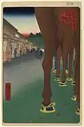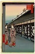 ![]() | 7. Comercios con artículos de algodón en Ōdenma-chō (大てんま町木綿店 Ōdenma-chō momendana?) (4-1858) | El barrio de Ōdenma-chō («gran barrio de caballos de correos») era una estación postal que centralizaba la mayor parte del transporte de mercancías en la capital nipona. Aquí se muestra una calle con un punto de fuga hacia la izquierda, jalonada de comercios dedicados al algodón, algunos de cuyos nombres se muestran en las inscripciones de las puertas: Tahataya, Masuya, Shimaya. En los tejados se vislumbran los soportes de unos recipientes que almacenaban agua de lluvia para sofocar posibles incendios. Por la calle transitan unas geishas, con unos kimonos grises decorados con libélulas, y rostros apenas perfilados con unos rasgos esenciales. En la composición general destaca la utilización del color azul en diversas gradaciones, empleado con gran maestría para conseguir efectos de sombreado.[22] | |||||||