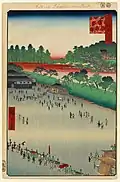 ![]() | 5. El templo Ekōin de Ryōgoku y el puente Moto-Yanagi (両ごく回向院元柳橋 Ryōgoku Ekōin Moto-Yanagibashi?) (i5-1857) | Se ve de nuevo una vista vertical con el monte Fuji y un amplio cielo azulado, desde una insólita perspectiva que, aunque se realiza desde el templo indicado en el título, éste no aparece, figurando en cambio en el lateral izquierdo un alto andamio de madera con un tambor en su cima, que muestra el gusto de Hiroshige por los elementos anecdóticos. Desde este andamio se tocaban los tambores en las competiciones de sumo celebradas en el templo –aquí se celebró el primer torneo de sumo en 1768–. El templo Ekōin, construido en 1657, pertenecía a la secta budista de la Tierra Pura (Jōdo), y fue construido para conmemorar a las 100.000 víctimas del incendio que arrasó la ciudad. Detrás del río Sumida, surcado de barcas y transbordadores, aparece la residencia Matsudaira, del señor feudal de Tanba, junto al puente Moto-Yanagi y un gran sauce llorón.[20] | |||||||