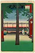 ![]() | 10. Amanecer en el santuario Kanda Myōjin (神田明神曙之景 Kanda Myōjin akebono no-kei?) (9-1857) | Si en la lámina anterior se veía el santuario a lo lejos, ahora el autor se sitúa en su propio recinto, en una terraza que ofrece una panorámica de los tejados de la ciudad, inmersos todavía en la oscuridad, mientras al fondo amanece. En primer plano se sitúa un alto y majestuoso cedro, que da una visión de verticalidad a la composición. Tras él se perciben las figuras de un sacerdote, una sirvienta del templo y su ayudante, con vestidos de vivos colores. El santuario Kanda Myōjin fue construido en 730, y era sede de unas fiestas patronales en las que la población de Edo entraba en procesión en el palacio del shōgun.[25] | |||||||