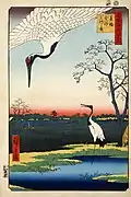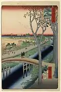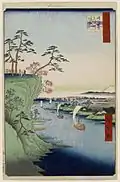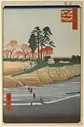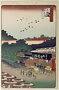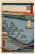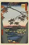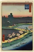 ![]() | 27. Jardín de ciruelos en Kamada (大田区蒲田 Kamada no umezono?) (2-1857) | Esta es una de las más bellas láminas de la serie, sobre todo por su tratamiento atmosférico y su exquisita paleta de colores para el cielo, desde el rosa blanquecino hasta el rojo oscuro, pasando por todas las gradaciones de estos colores, mostrando un amanecer lírico y evocador. La escena se desarrolla en un jardín de ciruelos, florecidos con sus delicadas flores blancas. Se ve en el medio fondo varios pabellones y personas paseando, mientras que en el lado derecho aparece recortado un palanquín, muestra del gusto del pintor por los elementos anecdóticos y las perspectivas inusuales. Esta estampa fue muy admirada en Occidente, especialmente por los impresionistas.[42] | |||||||