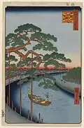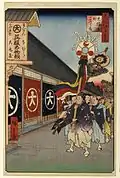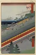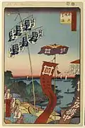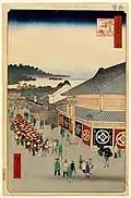 ![]() | 2. Kasumigaseki (霞が関 Kasumigaseki?) (1-1857) | Esta es una composición de acusada verticalidad, donde sobre un eje de una populosa calle de la ciudad se superpone un amplio cielo con diversas tonalidades de color. Se sugiere una cierta perspectiva lineal, en la calle que fluye hacia la bahía de Edo, pero ésta queda mitigada por el intenso cromatismo. En los dos extremos de la calle se encuentran dos residencias de señores terratenientes (daimyō): a la izquierda, los Asano de Hiroshima, y a la derecha, los Kuroda de Fukuoka. En los márgenes destacan también dos grandes pinos (kadomatsu). Entre la gente pueden reconocerse unos danzarines, un sacerdote y varios samuráis. En el cielo vuela una cometa que contiene el símbolo sakana («pez»), primer elemento del apellido del editor Sakanaya.[18] | |||||||