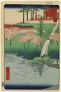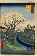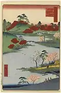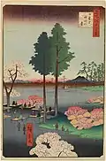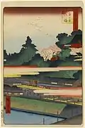 ![]() | 14. Jardines de un templo de Nippori (日暮里寺院の林泉 Nippori jiin no rinsen?) (2-1857) | En esta composición trazada nuevamente desde una perspectiva aérea se perciben unos jardines pertenecientes al templo de Shūshōin, donde destacan los cerezos en flor, elaborados en suaves tonalidades de rosa. El autor se permite la licencia de hacer coincidir la floración de los cerezos y las azaleas, que no sucede en la naturaleza. En algunas tiradas de esta lámina el color rosa de los dos cerezos de primer plano aparece cortado debido a un error de impresión. En el recinto de Nippori se encontraban templos budistas y sintoístas, en una pacífica convivencia que fue truncada con la abolición del budismo y la implantación del sintoísmo como religión oficial en 1868.[29] | |||||||