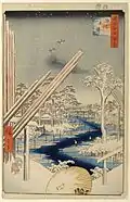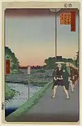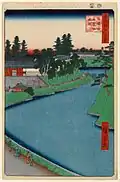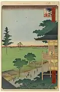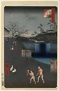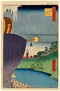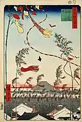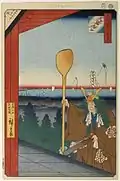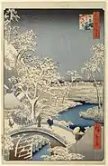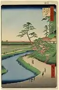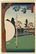 ![]() | 40. La ermita de Bashō y la colina de las camelias junto al acueducto de Sekiguchi (せき口上水端はせを庵椿やま Sekiguchi jōsuibata Bashōan Tsubakiyama?) (4-1857) | La ermita estaba dedicada al gran poeta Matsuo Bashō, y fue construida por sus discípulos en el cincuenta aniversario de su muerte, en 1743. Se encontraba en Tsubakiyama («colina de las camelias»), propiedad de la familia Hosokawa (a la que pertenece Morihiro Hosokawa, primer ministro de Japón entre 1993 y 1994). El acueducto de Sekiguchi era de los principales suministros de agua de la ciudad, y se mantenía con un impuesto anual que pagaban todos los habitantes. Por el camino deambulan pequeñas figuras, como es habitual en las composiciones de esta serie, para otorgar un factor humano al paisaje.[54] | |||||||