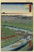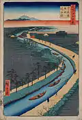 ![]() | 33. Gabarras en el canal Yotsugi-dōri (四ツ木通用水引ふね Yotsugi-dōri yōsui hikifune?) (2-1857) | Domina la composición el canal Yotsugi-dōri, al este del río Sumida, construido a principios del siglo XVII para llevar agua potable a la ciudad –aunque luego quedó como canal de riego y transporte–, que forma una gran curva y se pierde al fondo entre la neblina. El azul del río y el verde de la orilla contrastan con el brillante amarillo del camino que circunda el río, por el que andan varios viajeros, mientras varias barcas navegan por el río, algunas movidas con sogas por porteadores. Aunque el canal era recto, el autor se permite la licencia de serpentearlo para dar mayor efecto.[47] | |||||||