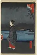 ![]() | 34. Vista nocturna de Matsuchiyama con el canal de San'yabori (真乳山山谷堀夜景 Matsuchiyama San'yabori yakei?) (8-1857) | Segunda imagen nocturna tras la lámina 4, y una de las pocas –con la 21– que muestra una figura humana de gran tamaño, en este caso una geisha. La mujer aparece de perfil, y el blanco intenso del maquillaje del rostro contrasta con el cielo oscuro plagado de estrellas, que se reflejan en las aguas del río Sumida. Cabe destacar en la figura femenina la precisión del peinado y de los ropajes, muestra de la formación del pintor en el arte de las bijin-ga. Al fondo se ven las luces de varios locales en la colina de Matsuchiyama, en cuya cima se hallaba el santuario de Shōten. De esta colina partía el canal de San'yabori, que conducía por vía fluvial al barrio de los placeres de Shin-Yoshiwara.[48] | |||||||