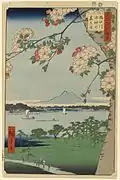 ![]() | 35. El bosque del santuario de Suijin y la región de Massaki a orillas del río Sumida (隅田川水神の森真崎 Sumidagawa Suijin no mori Massaki?) (8-1856) | De nuevo se nos muestra una vista desde un primer plano ocupado por un cerezo en el lado derecho, cuyas hermosas flores en tonos blancos y rosas se recrean en todo detalle, realizadas con la técnica de kimedashi («gofrado»), prensando el papel contra las marcas talladas de la plancha de madera. A los pies aparece el bosque del santuario de Suijin («divinidad acuática»), dedicado a la deidad del río Sumida, del que se ve el torii de entrada y un primer pabellón. En el camino, varias personas se dirigen al transbordador de Hashiba –que aparece en la lámina 37–, y al fondo se ve la región de Massaki y el monte Tsukubasan.[49] | |||||||