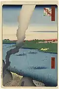 ![]() | 37. Los hornos y la barca de Hashiba a orillas del río Sumida (墨田河橋場の渡かわら竈 Sumidagawa hashiba no watashi kawaragama?) (4-1857) | Aparece de nuevo el transbordador de Hashiba de la lámina 35, que atraviesa el río Sumida, mientras el primer plano en la esquina inferior izquierda lo ocupan unos hornos de azulejos, de donde surge una columna de humo que se eleva al cielo, en una gradación de color de un gris oscuro hasta otro casi blanquecino. En el agua del río se mecen varias gaviotas de la especie miyakodori («ave de la capital»). En el bosque del fondo aparece el santuario de Suijin, y al fondo a la izquierda nuevamente el Tsukubasan. Las franjas azul y amarilla del cielo aparecen solo en las primeras tiradas, pues no estaban indicadas en la plancha, pero se corresponden con la técnica atenashi bokashi.[51] | |||||||