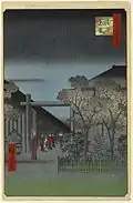 ![]() | 12. Ueno Yamashita (上野山した Ueno Yamashita?) (10-1858) | El principal foco de atención es el establecimiento de la derecha, un restaurante de comidas rápidas llamado Iseya, escrito en katakana y hiragana. Se percibe también en el cartel la inscripción shisomeshi, un plato de arroz con hojas de shiso. En la esquina inferior izquierda aparece un conjunto de elegantes damas con grandes sombrillas, que quizá se dirigen al cercano santuario de Ueno. En el cielo destaca una bandada de cuervos, que eran muy abundantes en esta región. Esta estampa se cree realizada por Hiroshige II, tras la muerte del gran maestro, aunque seguramente sobre algún boceto suyo, pues el nombre del autor de la serie aparece en la cartela roja de la esquina superior derecha.[27] | |||||||