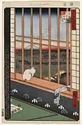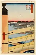 ![]() | 6. El picadero de Hatsune no baba en Bakuro-chō (馬喰町初音の馬場 Bakuro-chō Hatsune no baba?) (9-1857) | El picadero de Hatsune no baba –el más antiguo de Edo– se ve a través de una insólita perspectiva, a través de unas telas puestas a secar por los tintoreros del vecino barrio de Kon'ya, cuyos colores blanco, ocre y violeta armonizan con el cielo de fondo. Sobre los pabellones del picadero sobresale una torre de bomberos que daba servicio a toda la zona, un elemento familiar para Hiroshige, que había heredado el cargo de capitán de bomberos de su padre en 1809, y que a su vez legó a su hijo en 1832 para dedicarse de lleno a la pintura.[21] | |||||||