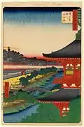 ![]() | 39. El templo Kinryūzan en Asakusa y el puente de Azumabashi desde lejos (吾妻橋金龍山遠望 Azumabashi Kinryūzan enbō?) (8-1857) | Se aprecia de nueva una insólita visión donde el paisaje es atravesado por una embarcación de recreo que, sin embargo, está cortada a ambos extremos, vislumbrándose a la izquierda el peinado y el vestido de una geisha de la que no se ve el rostro. Al fondo se ve un muelle y un conjunto de casas de las que sobresale el templo de Kinryūzan («templo del dragón dorado», actual Sensō-ji), al lado de cuyo edificio principal se yergue una pagoda de cinco pisos. Más lejano se eleva el nevado monte Fuji. En toda la composición flotan unas hojas de cerezo, dando un tono poético a toda la estampa, en el que se percibe el contraste entre lo efímero y lo eterno: las efímeras hojas frente al eterno Fuji, el efímero amor de la geisha frente al eterno misticismo del templo.[53] | |||||||