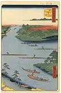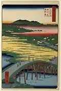 ![]() | 20. La barca de Kawaguchi y el templo de Zenkōji (川口のわたし善光寺 Kawaguchi no watashi Zenkōji?) (2-1857) | Domina la composición el río Sumida –llamado frecuentemente en este tramo Arakawa («Río Bravo»)–, que suponía el límite septentrional de Edo. El río aparece en diagonal, con una tonalidad más oscura en el centro, como la lámina anterior. Surcan sus aguas varias balsas madereras y una barca que ejercía de ferry. La nota de color la ponen los tejados amarillos de las cabañas, mientras que en el fondo derecho aparece el templo de Zenkōji, famoso por su hibutsu («Buda secreto»), que se mostraba tan solo cada 17 años. Quizá fue este efecto de secretismo el que buscó el autor al tapar parcialmente el templo con la cartela del título.[35] | |||||||