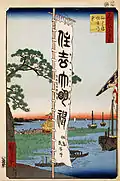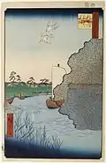 ![]() | 36. Vista desde la región de Massaki al bosque del santuario de Suijin, la pequeña ensenada del Uchigawa y al pueblo Sekiya no sato (真崎辺より水神の森内川関屋の里を見る図 Massaki atari yori Suijin no mori Uchigawa Sekiya no sato wo miru zu?) (8-1857) | En esta estampa se percibe con intensidad el gusto del autor por las perspectivas insólitas, mostrándose el paisaje a través de una ventana cortada por la mitad por una puerta corredera, tras la que aparece una rama de ciruelo. Probablemente se trate de una casa de té, y en la pared izquierda se ve parcialmente un jarrón con una flor de magnolia. La vista ofrece una panorámica de la región de Massaki, al norte del barrio del placer de Shin-Yoshiwara, circundado por el río Sumida, que es transitado por varias embarcaciones. En el bosque de la derecha aparece el torii del santuario de Suijin, que aparecía en la estampa anterior. Al fondo se ve el Tsukubasan, y atraviesa el cielo una bandada de pájaros.[50] | |||||||