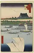 ![]() | 60. Los ríos Asakusagawa y Miyatogawa y la orilla del Ōkawa (浅草川大川端宮戸川 Asakusagawa Ōkawabata Miyatogawa?) (7-1857) | La acentuada verticalidad de esta imagen queda remarcada por la amplitud del cielo y la reducción del paisaje a una franja en la parte inferior, mientras que el costado izquierdo está cubierto nuevamente en un primer plano por un largo mástil formado por papeles rojos y blancos, propio de la peregrinación al monte Ōyama, en la prefectura de Kanagawa, 60 kilómetros al sur de Edo. El monte se abría a los peregrinos el día 27 del sexto mes, realizándose antes de la partida una ceremonia de purificación en el río Sumida, bajo el puente Ryōgoku, hecho mostrado en esta imagen. En el ángulo inferior izquierdo aparecen las cabezas de varios peregrinos, con pañuelos de color blanco y azul, mientras en el lado derecho otra barcaza transporta más pasajeros, encabezada por un asceta del monte (yamabushi), que toca una caracola. Este tramo del río Sumida recibía varios nombres, plasmados en el título; en tiradas posteriores, se cambió por Barcos cerca de Ryōgoku con una vista de Asakusa a lo lejos (Ryōgoku senchū Asakusa enkei), de más actualidad.[74] | |||||||