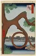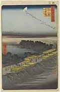 ![]() | 26. El «pino para colgar una armadura» y la cuesta de Hakkeizaka (八景坂鎧掛松 Hakkeizaka yoroikakematsu?) (5-1856) | Hakkeizaka («cuesta de las ocho vistas») era una famosa loma situada sobre la bahía de Edo, desde donde se podían contemplar ocho panorámicas de bellos paisajes de los alrededores. El nombre proviene de las Ocho vistas de Xiao y Xiang (en japonés Shōshō hakkei), un famoso tema poético introducido en el siglo XIV que servía de base iconográfica para la representación de paisajes pintorescos. Sobre la loma se situaba un pino de curiosa forma: según la leyenda, el guerrero Minamoto no Yoshiie colgó su armadura en este árbol, antes de someter a un clan rival en la provincia de Mutsu (actual prefectura de Aomori). El pino domina toda la parte central de la composición, sobre la bahía donde navegan varios veleros. En la línea de la costa se sitúa el Tōkaidō, el camino de Edo a Kyōto, que era muy transitado, como se puede ver en la lámina. Alrededor del pino se sitúan varias figuras más, que contemplan el panorama mientras toman té o sake.[41] | |||||||