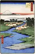 ![]() | 67. El transbordador de Sakasai (逆井のわたし Sakasai no watashi?) (2-1857) | Domina la composición el río Nakagawa («río medio»), en diversos tonos de azul, más oscuro el central por ser la parte más honda del río, y con un tono verdeazulado en la zona de cañaverales de la parte inferior. En el río y sobrevolándolo aparecen unas garzas reales, de un límpido color blanco, estucado sin pigmentos (karazuri). En la franja del horizonte se ve una zona boscosa a la izquierda y un pequeño poblado a la derecha, donde atraca el transbordador al que alude el título. Al fondo aparece la cadena montañosa de la península de Chiba, al este de Edo, envuelta en la bruma, bajo un cielo en tonos blancos y rojizos.[81] | |||||||