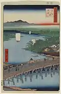 ![]() | 59. El puente Ryōgoku con la gran orilla (両国橋大川ばた Ryōgokubashi Ōkawabata?) (8-1856) | La imponente estructura del puente domina toda la parte central, densamente transitado por una multitud de viandantes. El puente Ryōgoku («dos países», llamado así porque unía las provincias de Shimōsa y Musashi) fue construido en 1660, y medía 160 metros, por lo que fue el mayor puente de su tiempo. Era el más antiguo que cruzaba el río Sumida, por lo que en principio fue llamado Ōhashi («gran puente»); así, cuando posteriormente se construyó un nuevo puente en 1693 –que aparecía en la lámina anterior– se denominó Shin-Ōhashi («nuevo gran puente»). El ancho río está transitado por numerosas barcas y algunos veleros, mientras que en la orilla correspondiente a la parte inferior de la imagen aparecen varias casas de té y locales de diversión, formando con la orilla opuesta una composición en forma de Z.[73] | |||||||