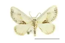 Tiene sus alas blancas con una serie de pequeños puntos grises a lo largo del borde exterior del ala delantera y en el borde interior tiene una gran mancha marrón oscura, tiene tonos amarillentos y grises hacia la mitad del ala. Esta mancha parece un símbolo, tal vez una letra china. En su posición de descanso, imita los excrementos de los pájaros.