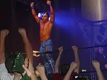 - Springboard derivado en moonsault,[15] double axe handle,[16] spinning heel kick o double foot stomp
