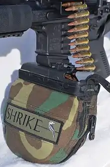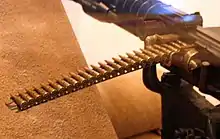 - Esta obra contiene una traducción derivada de «Belt (firearms)» de Wikipedia en inglés, publicada por sus editores bajo la Licencia de documentación libre de GNU y la Licencia Creative Commons Atribución-CompartirIgual 3.0 Unported.