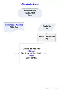 Siendo B la latitud, (+N/-S), L la longitud, (+E/-W). LHA = GHA + L es el ángulo horario local, Dec y GHA son la declinación y el ángulo horario en Greenwich del astro observado. Y Ho es la altura verdadera, es decir, la altura medida con el sextante corregida.