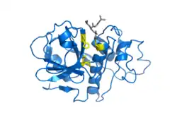 Las cisteína proteasas, también conocidas como tiol proteasas, son enzimas hidrolasas que degradan las proteínas. Estas proteasas comparten un mecanismo catalítico común que implica un tiol de cisteína nucleófilo en una tríada o díada catalítica.[1]