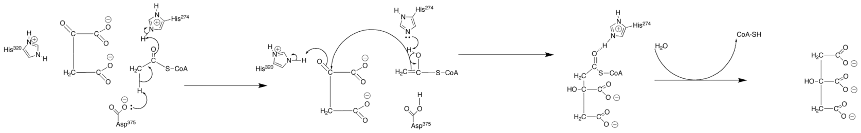- La conversión comienza con el oxígeno cargado negativamente situado en el grupo R del Asp-375 deprotonando el carbono alfa del acetil-CoA. Esto empuja al electrón para formar un doble enlace con el carbono carbonilo, que fuerza al C=O a desplazar un protón para el oxígeno desde uno de los nitrógenos del grupo R de la His-274. Esto neutraliza el grupo R (formando un par solitario en el nitrógeno) y completa la formación de un intermedio enol (CH2COH-SCoA).