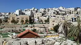 "El lugar se divide en tres secciones distintas: la primera, que incluyeel Haret el Haram (o el Kulah) y Haret Bab er Zawieh, la parte principal con el Haram en el centro; la segunda, Haret esh Sheikh, llamada así por la mezquita del jeque 'Aly Bukka, que se encuentra en ella; y la tercera, Haret el Mesherky, que queda hacia el este, al lado occidental de la carretera principal. La ciudad se extiende a lo largo de tres cuartos de milla [1,20 kilómetros] en paralelo al valle. Las casas están bien construidas con piedra, con tejados planos que presentan cúpulas en el centro. La parte más importante es el recinto del Haram, que destaca sobre los tejados de las casas. La mezquita que se encuentra en ella y la parte superior del gran muro perimetral fueron encalados en 1874 y presentaban una experiencia muy deslumbrante. La ciudad ha crecido desde 1875, por lo que estos barrios están casi conectados, y el barrio de los judíos se ha agrandado especialmente. A los cuatro barrios nombrados anteriormente debe añadírseles otros seis, a saber: Haret el Kezazin, el barrio judío, al noroeste del Haram; Haret Beni Dar, justo al oeste del Haram; Haret el 'Akkabeh y Haret el Kerad, en la colina detrás del Haram; Haret el Muhtcsbin, al sudeste del Haram y del gran estanque; y Haret es Suwakineh, al norte del Haram y al este del barrio judío."[7]