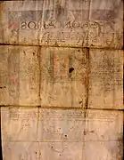 ... En la mui Noble e Mui Leal Cibdad de Tlaxcallan desta Nueba España, a 29 dias del mes de agosto de 1582 años el Ylustre Señor Alonso de Naba Alcalde Maior desta cibdad e su provincia por su mgd e por prescencia de mi el prescente Escriuano perscio el mui reverendo padre fray diego Rangel el guardian del conbento del bien abenturado e cerafico señor san francisco desta dha cibdad al qua lio el perscente escriuano doi fee que conozco e dixo que a los rreligiosos desta dha horden como a primeros pobladores de la Yglesia de Dios en esta dha nueva spaña conviene aueriguar e prouar de cómo una imagen de la serenissima reyna de loa angeles la virgen sacta Maria madre de Dios q. Don hernado Cortes marques del Valle capitán general e descubridor que fue desta dha nueva Spaña e la cavo la dio a don goncalo acxotecatl cocomitzi yndio capitan e principal desta dha cibdad por la muncha amistad que le tenia por aver seydo tan leal e amigo e heverle aiudado tamvien a la dha conquista para que la truxe sea esta dha cibdad por ser la primera desta dha nueva España donde se predico el sacto Euangelio e de como el dho don goncalo la truxo a esta dha cibda de la tubo en su poder mucho tiempo e para q se sepa q esta dha ymagen es la q esta al prescente en la cibdad de los angeles (Puebla) en el monesterio de la dha horden e lo firmo de su nombre fray diego Rangel. E por el dhoseñor alcalde maior bisto dho pedimento dixo que prescente los testigos de q se pretende aprouechar q su mrd esta presto de esaminarlos e se de por testimonio. Alonso de Naba. Paso ante mi, toribio de Medina Viya escriuano de su mgd...