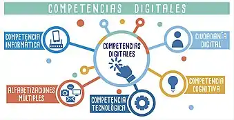 Las competencias digitales se definen como un espectro de competencias que facilitan el uso de los dispositivos digitales, las aplicaciones de la comunicación y las redes para acceder a la información y llevar a cabo una mejor gestión de éstas. Estas competencias permiten crear e intercambiar contenidos digitales, comunicar y colaborar, así como dar solución a los problemas con miras al alcanzar un desarrollo eficaz y creativo en la vida, el trabajo y las actividades sociales en general.[7]