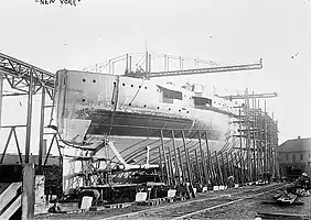 La financiación de los acorazados fue autorizada en una ley el 24 de junio de 1910, que exigía que las embarcaciones no costaran más de $6 millones de dólares. La ley también especificaba nuevas políticas laborales para la construcción que imponía límites estrictos a las horas y condiciones de trabajo para los empleados de los astilleros.[21] Se solicitaron ofertas solo para el acorazado número 32, Texas, el 27 de septiembre de 1910, mientras que el acorazado número 34, New York, iba a ser construido por el New York Navy Yard. Las ofertas para el Texas fueron abiertas el 1 de diciembre.[5] Finalmente, la Newport News Shipbuilding Company ganó el contrato con una oferta de $5,830,000.[22] La construcción del acorazado comenzó primero, el 17 de abril de 1911, fue botado el 18 de mayo de 1912, y finalizado el 12 de marzo de 1914. El New York fue puesto el 11 de septiembre de 1911, botado el 30 de octubre de 1912, y finalizado el 15 de abril de 1914.[6]