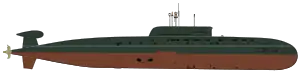 Tubos de torpedo 4 × Ø 650 mm. Tubos de torpedo 2 × Ø 530 mm. Misil de crucero Raduga Kh-55 con ojiva nuclear de 200 kilotones Arma antisubmarino SS-N-15 Starfish con carga de profundidad de 200 kilotones o torpedo HE Type 40 de 90 kg. SS-N-16 Stallion con carga de profundidad de 200 kilotones o torpedo HE Type 40 de 90 kg. Configuración de colocación de minas: 42 minas en lugar de torpedos. | |