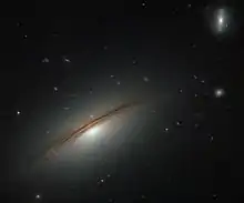 - Las galaxias lenticulares (designado S0) también consiste en un brillante bulbo central rodeado por una estructura extendida, similar a un disco pero, a diferencia de galaxias espirales, los discos de las galaxias lenticulares no tienen estructura espiral visible y no están formando activamente estrellas en ninguna cantidad significativa.[6][7]