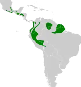 Ocupa un área de distribución muy discontinua que se extiende desde los altiplanos de México, por Guatemala, Honduras, El Salvador, Nicaragua, Costa Rica, Panamá, Colombia, hacia el este por Venezuela, Guyana, Surinam, Guayana francesa y noreste de la Amazonia brasileña; hacia el sur por los Andes y cuenca amazónica occidental de Ecuador, Perú, extremo oeste de Brasil y noroeste de Bolivia.[5]