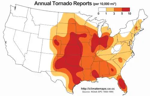 Estados Unidos tiene la mayor cantidad de tornados de cualquier país.[17] Muchos de estos se forman en un área de EE. UU. central (con algunas definiciones incluyendo el sur) conocido como el Corredor de tornados.[18] En EE. UU. hay dos regiones con una frecuencia de tornados desproporcionadamente alta: Florida es uno y el otro es el "Corredor de tornados" en el centro-sur de Estados Unidos. Florida tiene numerosos tornados simplemente debido a la alta frecuencia de tormentas casi diarias.[19]