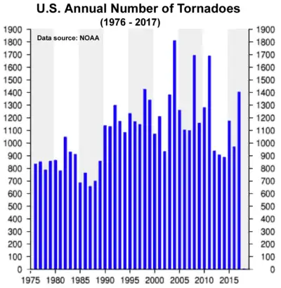 La climatología confiable de tornados, es muy limitada en alcance geográfico y temporal, pues, solo se registran, desde 1976 en EE. UU.; y, 2000 en Europa, estadísticas minuciosas y precisas de tornados.[51][52] Sin embargo, algunas tendencias se pueden notar en los tornados que causan daños significativos en EE. UU., ya que existen estadísticas algo fiables sobre tornados dañinos desde 1880. La mayor incidencia de tornados violentos, pareciera desplazarse del sudeste estadounidense al sur de las Grandes Llanuras cada pocas décadas. Además, en la década de 1980, pareciese ser un período de actividad de tornados inusualmente baja en EE. UU., y el número de tornados multimortales disminuyó cada década desde la década de 1920 hasta la década de 1980, lo que sugiere un patrón de varias décadas de algún tipo.[53]