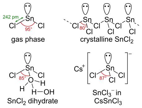 El SnCl2 posee un par de electrones no compartidos, de forma tal que la molécula en la fase gaseosa se encuentra torcida. En estado sólido, el cristal SnCl2 forma cadenas conectadas mediante puentes cloruro tal como se muestra. El bihidrato también se encuentra coordinado en forma triple, con un agua coordinada con el estaño, y una segunda agua coordinada con la primera. La parte principal de la molécula se apila en capas dobles en la red cristalina, con la "segunda" agua contenida entre las capas.