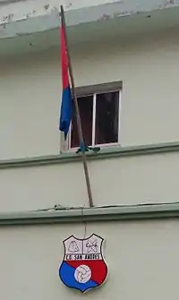 La Bandera del Club Deportivo San Andrés se compone de un rectángulo dividido verticalmente entre el color rojo, pegado al mástil, y el azul. En el centro de la bandera, donde se unen ambos colores se encuentra el escudo de la entidad.