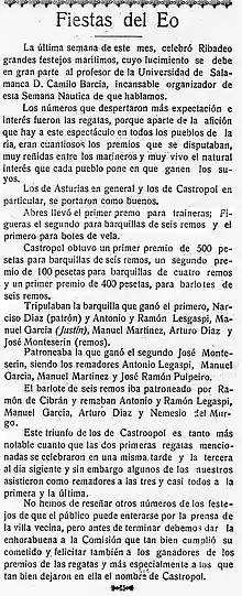 Dicho de otra manera, el club nació para encuadrar la presencia de los remeros de Castropol en las regatas de bateles disputadas en la ría del Eo a partir de 1949, que levantaban una enorme expectación en toda la zona asturgalaica cercana. El tremendo apasionamiento alrededor de ellas prosiguió en los años siguientes, reforzado en el caso de Castropol por una enconada rivalidad con Ribadeo y unos resultados crecientemente halagüeños que culminaron en los dos subcampeonatos nacionales conseguidos en 1951 y 1953. Y a partir de 1954 el desistimiento de Ribadeo (el pueblo del Eo que mayores, si no mejores, recursos humanos, organizativos y pecuniarios podía dedicar, y de hecho dedicó, al remo) dejó prácticamente sin rivales cercanos de consideración a Castropol, que desde entonces empezó a volar solo por el espacio remero español, y al cabo también por el internacional; en una trayectoria que desde las fiestas locales de Santiago y de San Roque de 1949, pasando por las más multitudinarias regatas de traineras de las capitales gallegas, cántabras o vascas, ha conducido a la presencia de remeros castropolenses en los Juegos Olímpicos de Barcelona, Atlanta y Sídney.