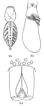 ![]() 60, espalda de hembra ampliada cuatro veces para mostrar marcas. 61, palpos de macho. 62, frente a la cabeza y mandíbulas de macho. | ||