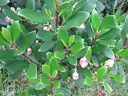 Las inflorescencias surgen en panículas cortas con flores de color rosado, más fuerte en la base de los pétalos, coriáceas, de consistencia como de cera o plástico. Sus frutos son cápsulas ovoides verdes inicialmente, pero amarillas al madurar.