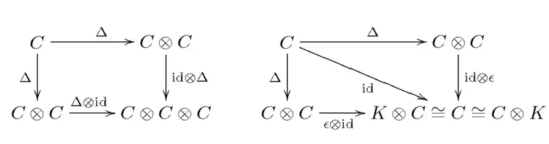 El primer diagrama es el dual del que expresa la asociatividad de la multiplicación de álgebras, y se denomina coasociatividad de la comultiplicación. El segundo, es el dual del que expresa la existencia de una identidad multiplicativa. De esta forma, se dice que la aplicación Δ es la comultiplicación o coproducto de C y ε es la counidad de C.