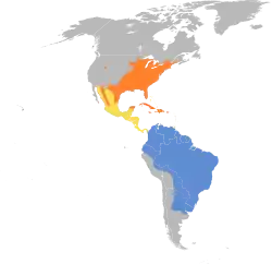 El cuclillo piquigualdo está ampliamente distribuido por América, cría en Norteamérica, las Antillas Mayores y la península de Yucatán y migra en invierno a Sudamérica.