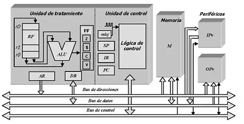 - Biestables indicadores (FF) para gestionar las instrucciones condicionales de salto o de llamadas a subprogramas. Se incluyen biestables de cero (Z), signo (S), acarreo (C) y desbordamiento (V).