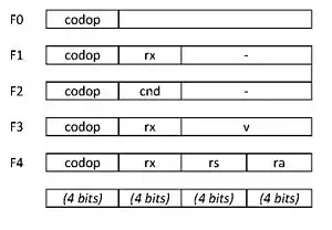 El repertorio de instrucciones de CODE-2 considera cinco tipos de formatos (F0 a F4), utilizando cada instrucción uno de ellos (ver Figura 3). Todas las instrucciones comienzan con un campo de 4 bits que corresponde al código de operación (codop). Por tanto CODE-2 puede tener como máximo 16 instrucciones. Los otros campos de la instrucción hacen referencia a los operadores de la instrucción y dependen del formato asociado a la instrucción.