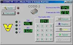 En la definición del repertorio de instrucciones máquina y en el desarrollo de CODE-2 colaboraron, con el profesor Prieto, los también profesores Antonio Cañas, Julio Ortega, Francisco Pelayo y Francisco Gómez Mula.[6][7] El alumno Antonio Martínez Álvarez (actualmente profesor de la Universidad de Alicante) se hizo cargo de la realización de un emulador y un ensamblador de CODE-2, así como de todo un entorno didáctico (denominado ECODE)[8] que permite comprobar el funcionamiento tanto externo como interno del computador, y que puede ser descargado como software libre.