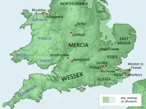 Durante la mayor parte del siglo VIII, Mercia era dominante entre los reinos anglosajones al sur del río Humber. Æthelbald, que llegó al trono en 716, se estableció como señor de los anglosajones del sur hacia 731.[1] Fue asesinado en 757, y sucedido brevemente por Beornred, pero al cabo de un año Offa lo derrocó y accedió al trono. Eadburh, hija de Offa, se casó con Beorhtric de Wessex en 789, y Beorhtric se convirtió en aliado.[2] En Kent, Offa intervino decisivamente en la década de 780 y en algún momento se convirtió en señor de Estanglia, cuyo rey, Æthelred, fue decapitado por orden de Offa en 794.[3][4]