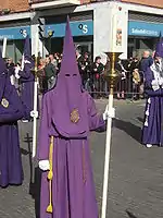 Túnica de tergal morada, con el escudo de la cofradía en el antifaz, cíngulo dorado y guantes blancos. Sus cerca de 2.000 nazarenos penitentes llevan cruces a cuestas a excepción de los nazarenos de la Hermandad de la Dolorosa, que portan cirios.