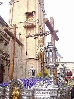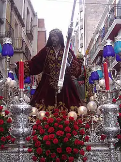 La efigie se encuentra acompañada de un cirineo, un sayón y un soldado romano, con atuendos de los tradicionales “Armaos” de Orihuela, obra del escultor valenciano Felipe Farinós en 1859.