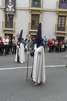 Túnica | Morada y blanca (blanca y verde en la Hermandad de la Virgen de la Esperanza) | |